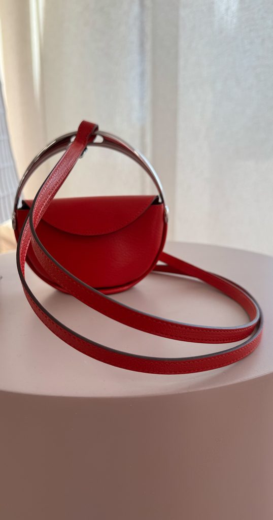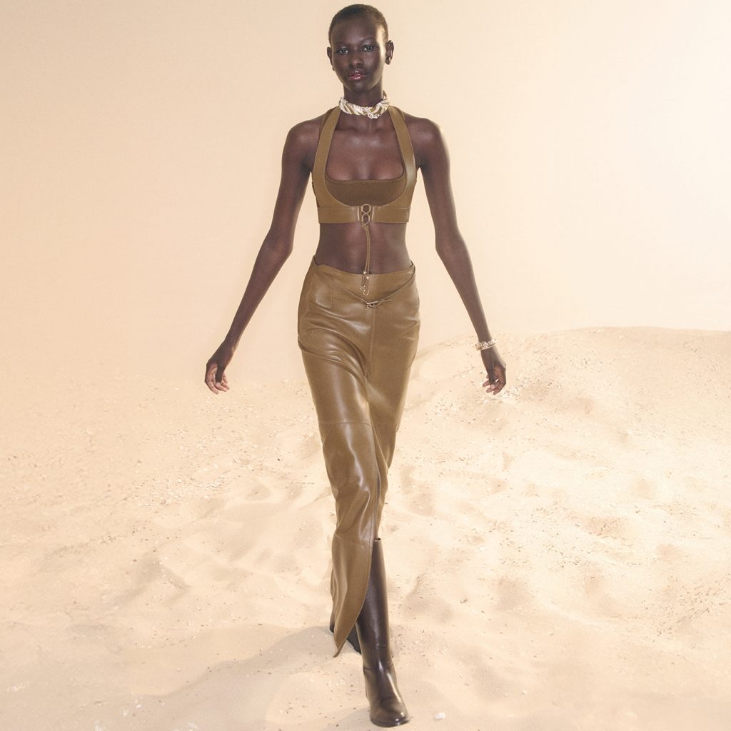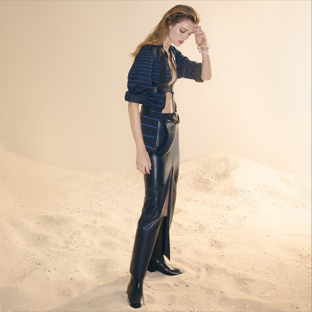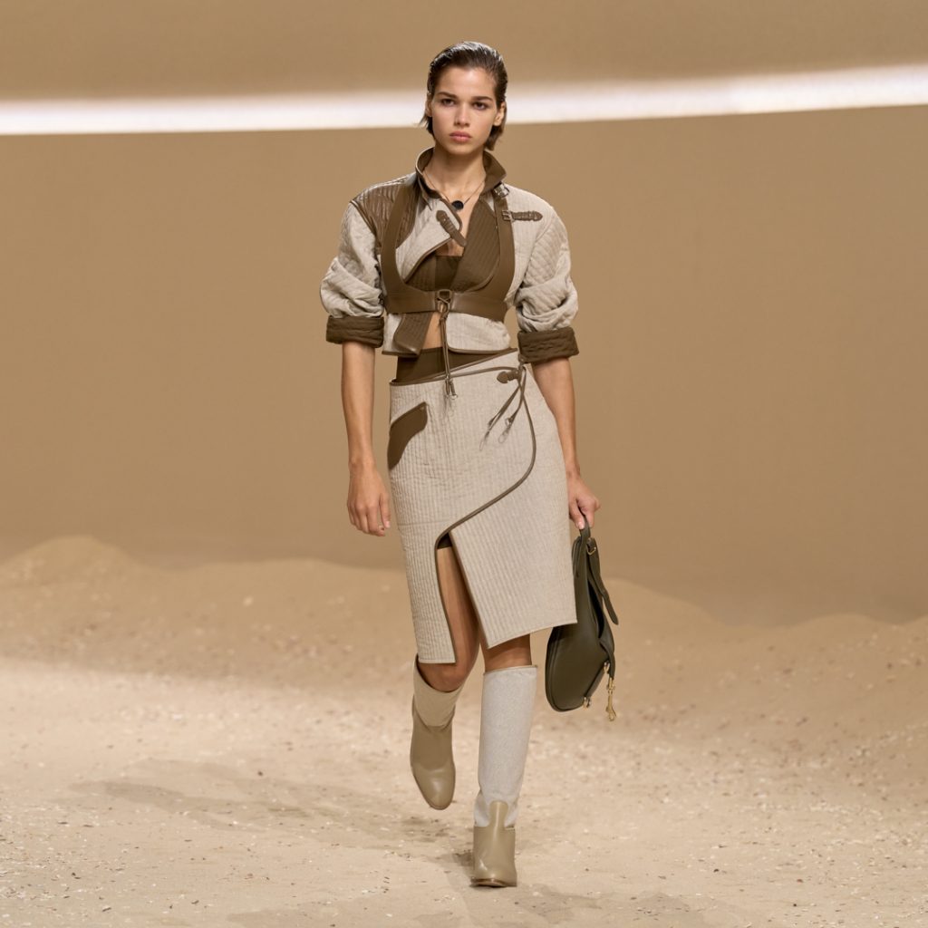 Nadège Vanhée’s starting point is this natural region and its spirit of freedom. The wild nature, the horses, the flamingos and bulls, it all translates into a sensual, tactile collection titled Free Rein, taking the equestrian heart of Hermès. You can sense it in the stitching, in structured fabrics printed to mimic armour, and in supple leather shaped like a modern harness. Every detail nods to the original halter of the horse, now reimagined.