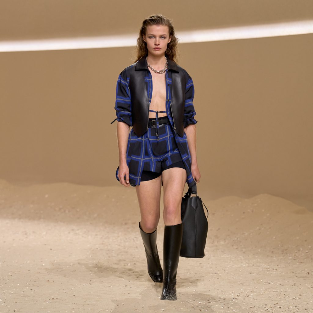 The new collections express a calm kind of strength. Layers of silk and smooth leather move with the body, forming a second skin rather than armour. The woman of Hermès this season feels composed, her confidence resting in detail: a scarf folded through a cropped bustier, a fine belt tracing the waist, the gentle sheen of leather catching the light. The palette shifts between warmth and depth, from bright reds and beige browns to the new blue noir, a tone both elegant and enigmatic. Miniature round bags and precise tailoring elongate the silhouette, while micro shorts and salopettes with subtle workwear touches, a metal eyelet now holding a silk scarf, connect craft with ease. Under Nadège Vanhée’s hand, freedom truly becomes the new luxury.