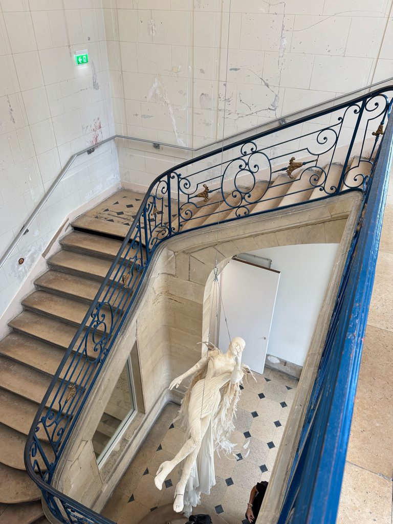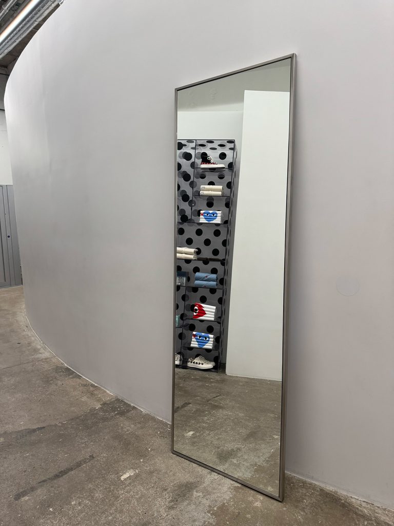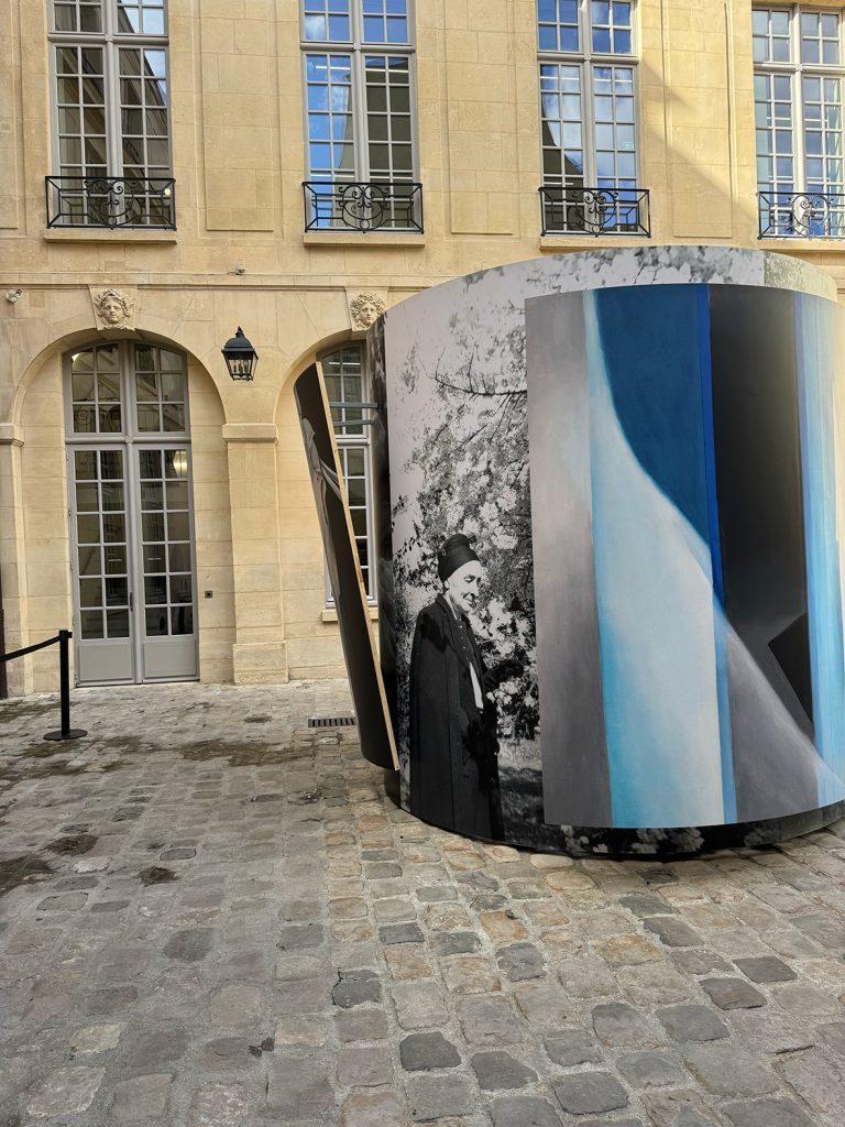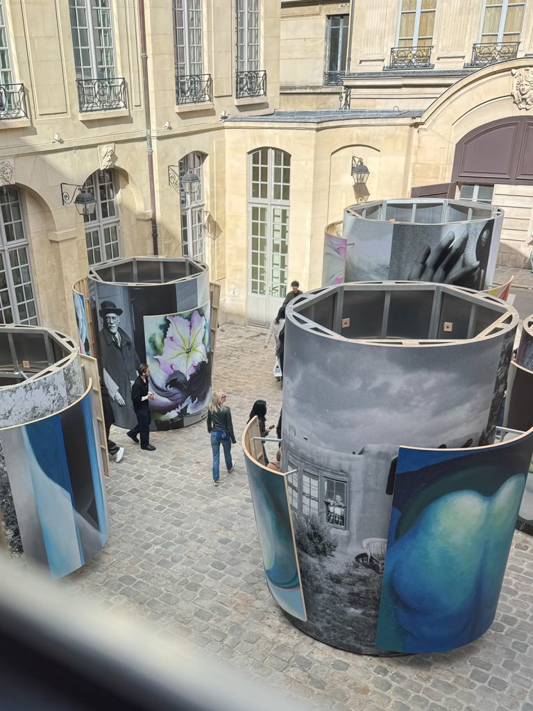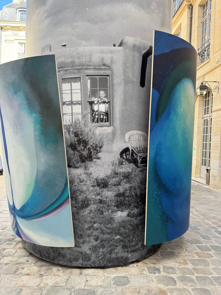 In the courtyard, the Japanese designer curated and designed this ode to O’Keeffe. Monumental metal pillars transform into a visual conversation. Black and white photographs from the Georgia O’Keeffe Museum archives, some taken by O’Keeffe herself, wrap around the columns, layered with reproductions of her most evocative paintings. The result feels architectural and almost spiritual. Just like a fabric hugging the body, steel and image merge into another art dimension. Walking through the courtyard, the round columns create a striking juxtaposition in the middle of the square. From the upper floors, the installation reveals a different rhythm, seen from above as a constellation of forms.