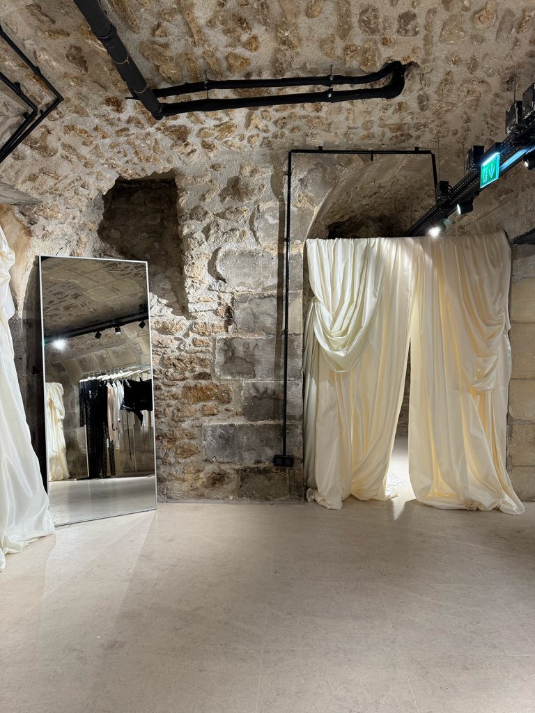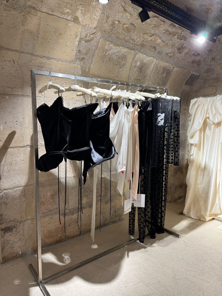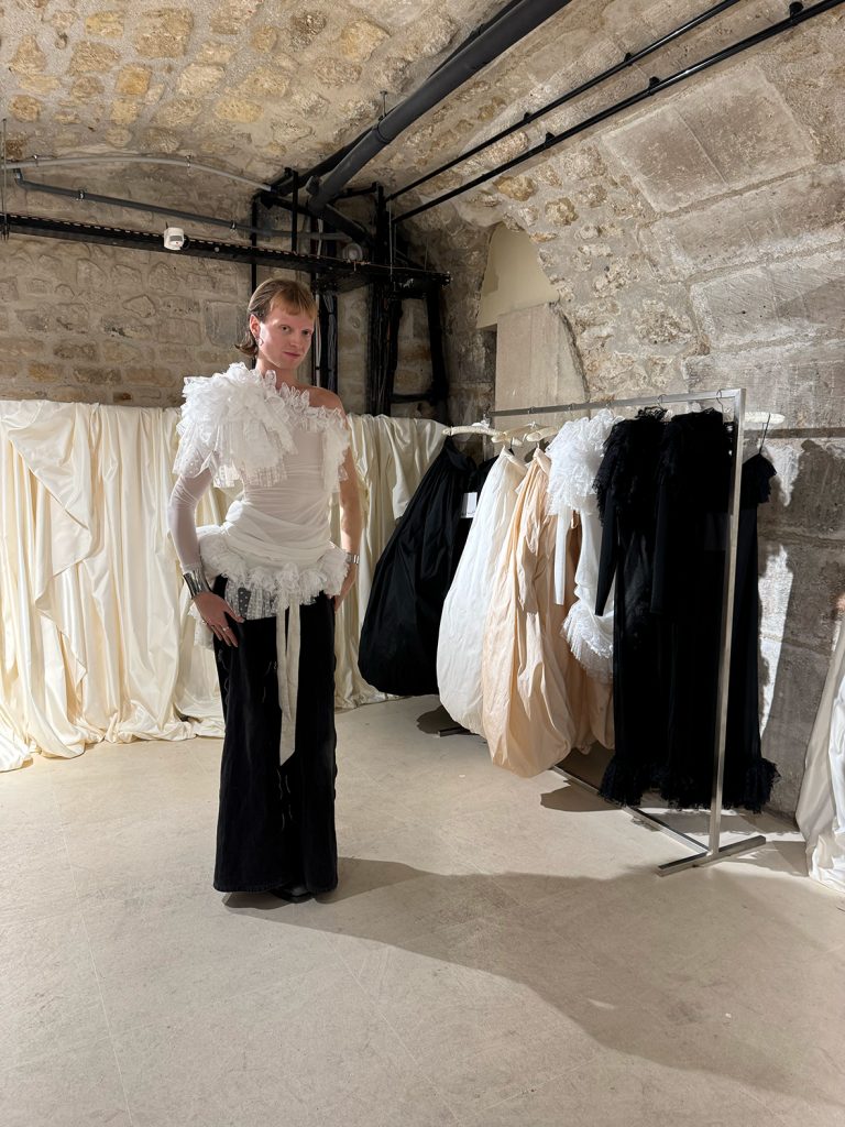 In the basement of Dover Street Market Paris, layers of black and white tulle fill the room. Large panels of fabric hang from the ceiling, turning the space into a romantic dressing room where the magic begins. Here, New York designer Miss Claire Sullivan presents her monochromatic trunk show, a playful and refined edit that turns fashion into a living performance.