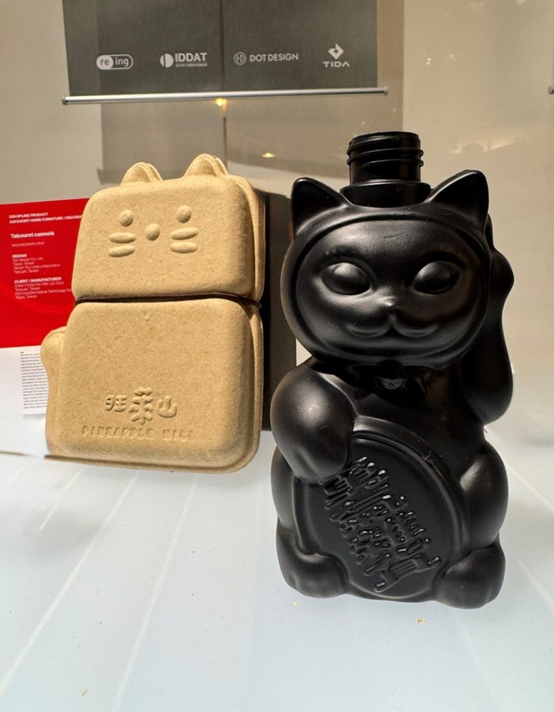 Among the many objects on display, a modern take on the classic Lucky Cat, or Maneki-neko, caught my attention. The figurine, made from recycled materials such as marine plastic and pineapple peel, carries its own optimism — a wink to sustainability with a cultural pulse. Created by DOT Design, the playful box containing three pineapple cakes can later become a small vessel or even a piggy bank. I love objects that outlive their first function, thoughtful design that extends its purpose, invites you to keep it and reuse it.