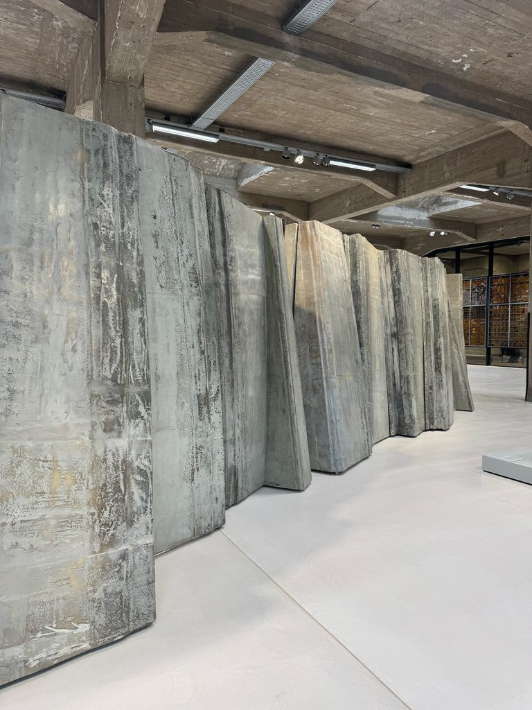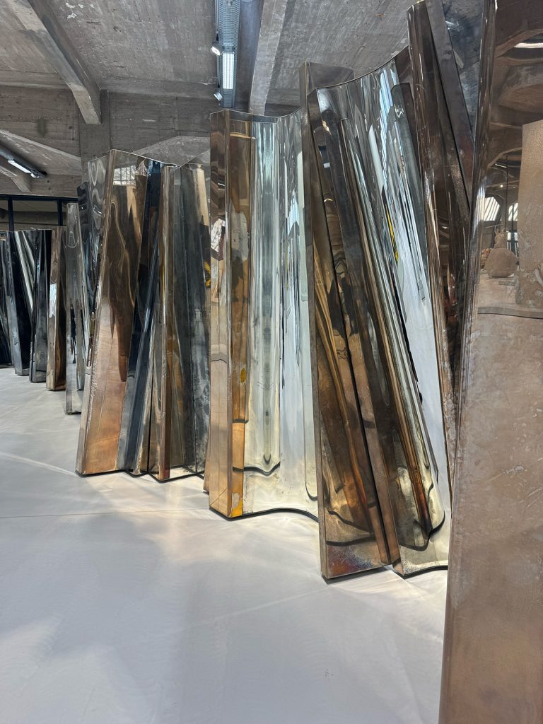 The second hall shifts the atmosphere and narrative. Vincenzo de Cotiis’ Ode installation unfolds as an immersive composition of mirrors and concrete, creating a fractured landscape where reflections multiply and surfaces distort. The viewer becomes part of the structure, caught between illusion and solidity. On one side, the uneven mirrored surfaces naturally invite selfies as much as moments of self-reflection, while the raw concrete asserts material permanence.